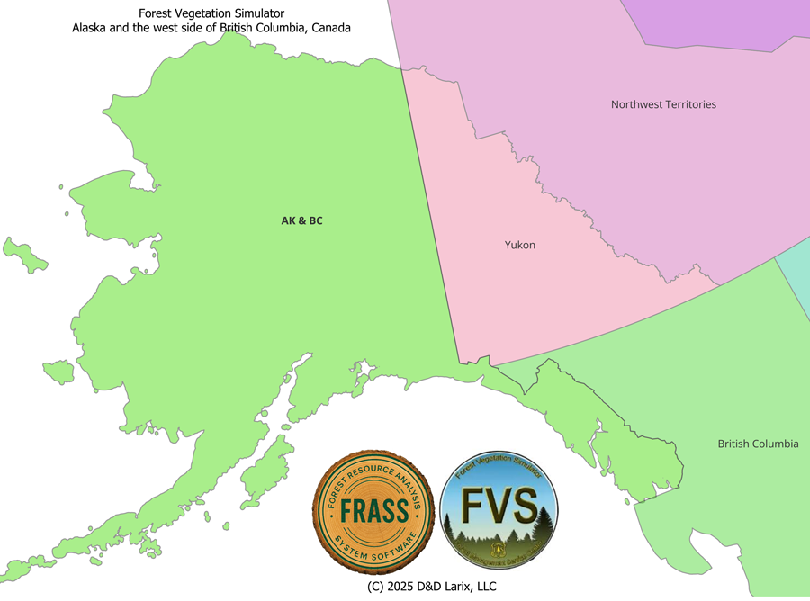 Alaska and the coastal forests of British Columbia are presented separately because their growth dynamics differ substantially from those of the continental United States. Longer rotations, distinct disturbance regimes, and coastal climate influences require specialized biometric treatment. FRASS maintains this separation explicitly to preserve biological accuracy while enabling seamless integration with delivered log markets operating in both U.S. Dollars (USD) and Canadian Dollars (CAD).
