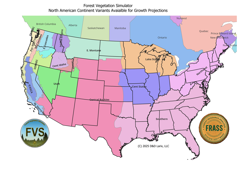 Each color in Figure 1 represents a distinct FVS variant, calibrated to regional forest conditions such as species composition, productivity, disturbance regimes, and management history. FRASS inherits this regional specificity directly, ensuring that tree growth, stem form, and volume reconciliation are consistent with accepted biometric standards throughout the continental United States.