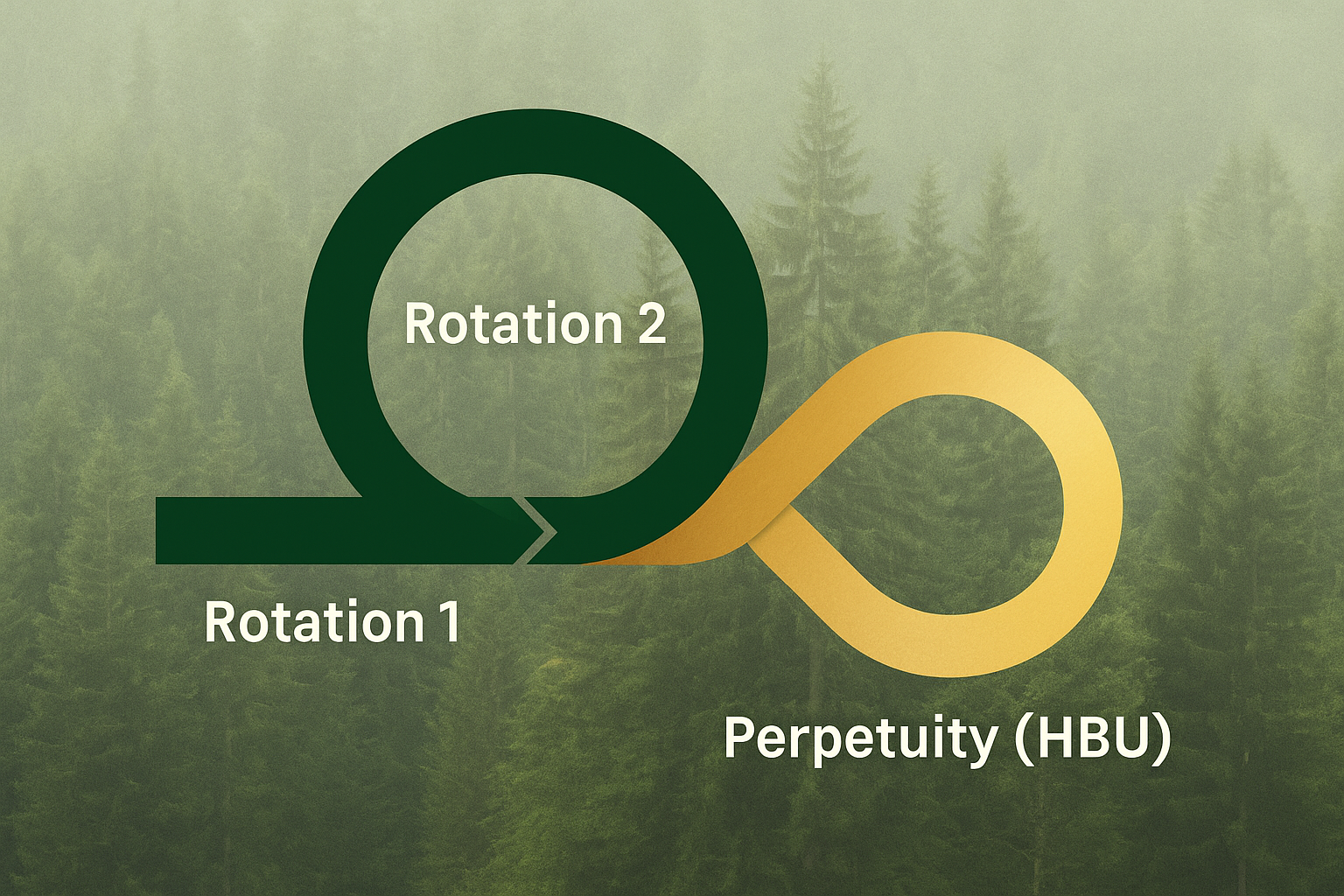 In FRASS, a forest property is not valued by looking at a single harvest. It is valued by following the forest through Rotation 1 (the current stand), Rotation 2 (the replanted stand), and then into a perpetuity tail where rotations repeat in equilibrium. Together, these horizons reveal the Highest and Best Use (HBU) value of the asset and connect directly to the landowner’s financial accounts.